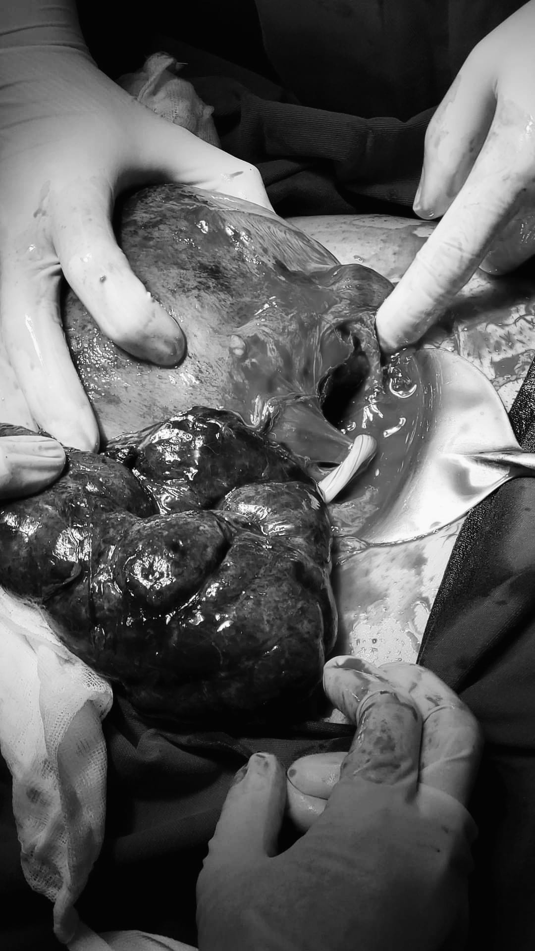 Trong ổ bụng có nhiều máu tươi, tử cung vỡ vị trí sẹo mổ lấy thai kích thước 7cm, bánh rau nằm trong ổ bụng .