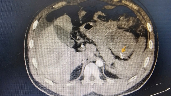 Sau khi hồi sức tích cực, bệnh nhân được chụp cắt lớp vi tính đa dãy (MSCT) ổ bụng và hình ảnh cho thấy: rất nhiều dịch máu trong ổ bụng, nguyên nhân do vỡ giả phình động mạch lách ngay vị trí rốn lách – thủ phạm gây xuất huyết ồ ạt.