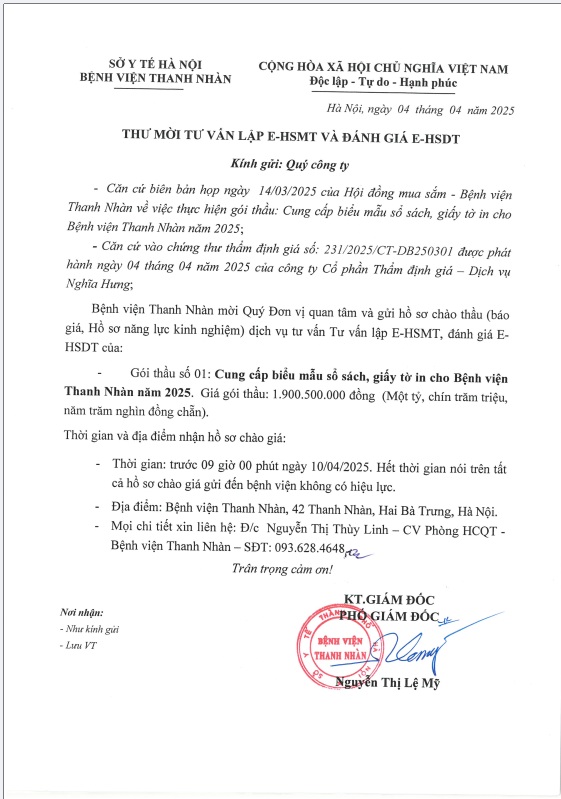CV 1760 thư mời chào giá cung cấp dịch vụ tư vấn đấu thầu cho gói thầu: Mua sắm máy gây mê ( kèm thở ) năm 2025 cho bệnh viện Thanh Nhàn.